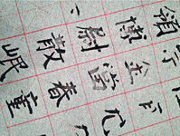 這種用具是一張叫「鳳凰宣」的九宮格「紙」,不用墨,直接用毛筆醮了水往上寫字,寫上去的「水字」呈深黑色,猶如濃墨一般,但水乾之後,字跡就會消失,然後可再寫,重複使用,十分乾淨(jìng)方便。