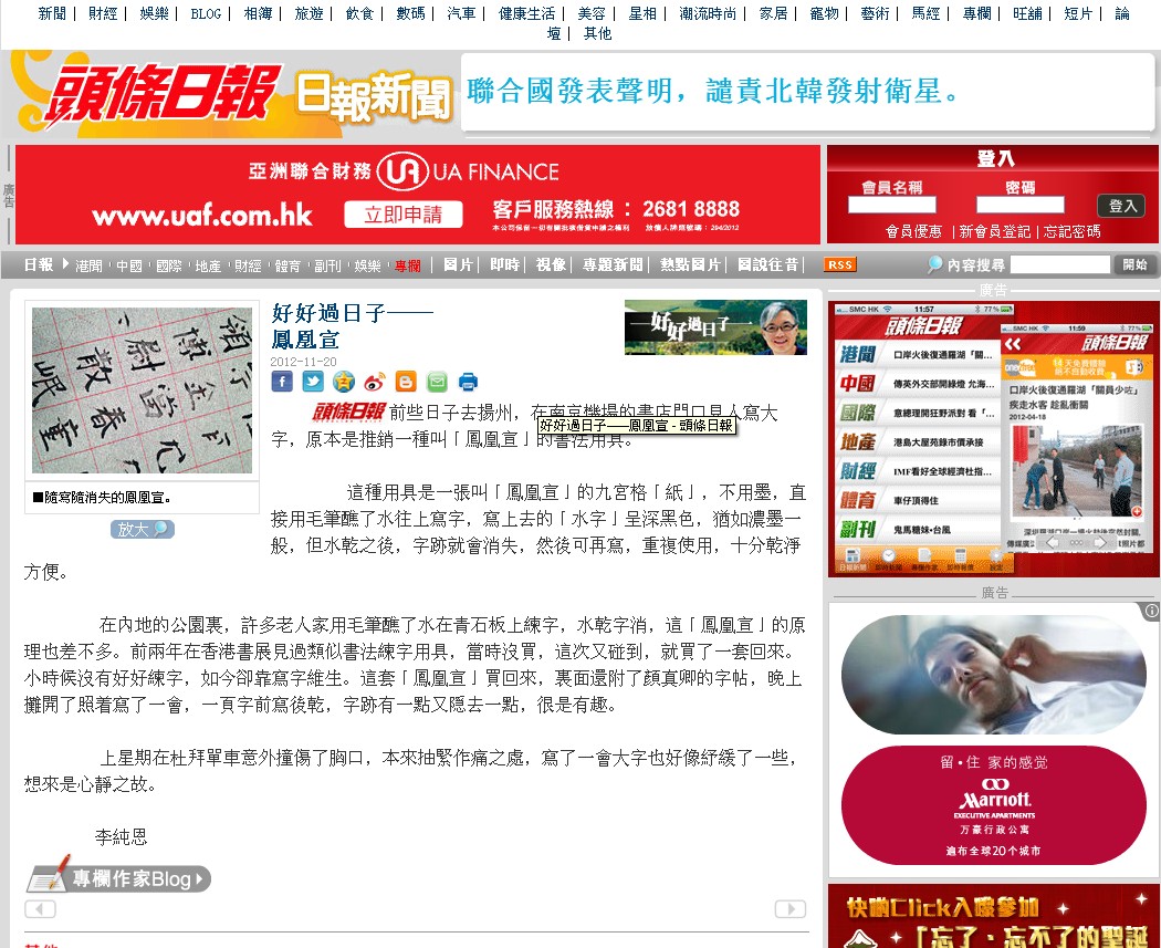 在內(nèi)地的公園裏,許多老人家用毛筆醮了水在青石板上練字,水乾字消,這「鳳凰宣」的原理也差不多。前兩年在香港書展見過類似書法練字用具,當(dāng)時沒買,這次又碰到,就買 了一套回來。小時候沒有好好練字,如今卻靠寫字維生。這套「鳳凰宣」買回來,裏面還附了顏真卿的字帖,晚上攤開了照著寫了一會,一頁字前寫後乾,字跡有一點又隱去一點,很是有趣。