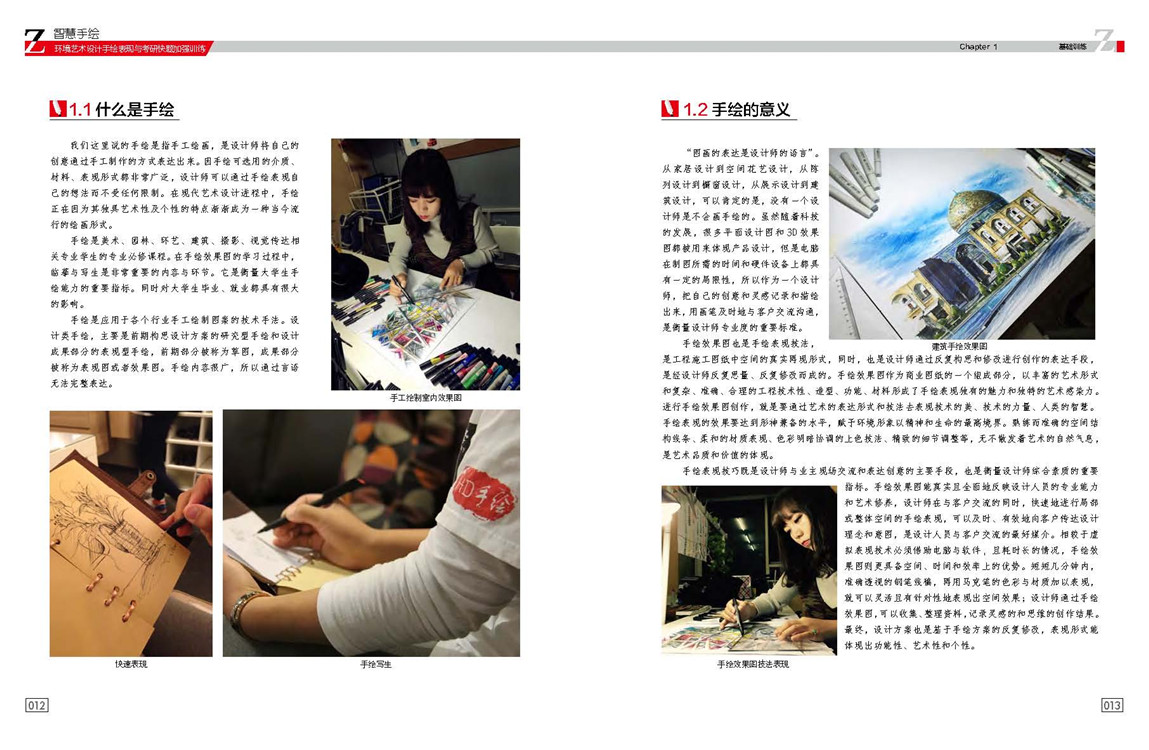 行的繪畫(huà)形式。手繪是美術(shù)、園林、環(huán)藝、建筑、攝影、視覺(jué)傳達(dá)相關(guān)專業(yè)學(xué)生的專業(yè)必修課程。在手繪效果圖的學(xué)習(xí)過(guò)程中,臨摹與寫(xiě)生是非常重要的內(nèi)容與環(huán)節(jié)。它是衡量大學(xué)生手繪能力的重要指標(biāo)。同時(shí)對(duì)大學(xué)生畢業(yè)、就業(yè)都具有很大的影響。手繪是應(yīng)用于各個(gè)行業(yè)手工繪制圖案的技術(shù)手法。設(shè)計(jì)類手繪,主要是前期構(gòu)思設(shè)計(jì)方案的研究型手繪和設(shè)計(jì)成果部分的表現(xiàn)型手繪,前期部分被稱為草圖,成果部分被稱為表現(xiàn)圖或者效果圖。手繪內(nèi)容很廣,所以通過(guò)言語(yǔ)無(wú)法完整表達(dá)。