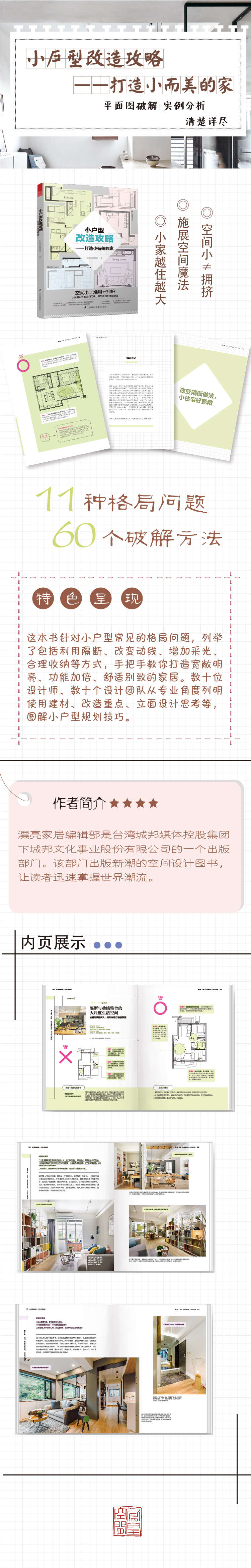 這是一本從讀者裝修小住宅會(huì)碰到的實(shí)際狀況,給予一步步照著做的圖解化知識(shí),各種小住宅戶型的裝修問題,清楚列出幾款做法供讀者對(duì)應(yīng)參照,提供直接、清楚、快速的裝修建議的書。如何改變隔斷,增加房子的寬敞度;如何規(guī)劃動(dòng)線,保證住宅的舒適;如何開放共享格局,增加小住宅的明亮度;如何化零為整、如何做好收納……書中對(duì)于小住宅11種常見的格局問題,列舉了60種破解的方法,是小住宅裝修的參考書。