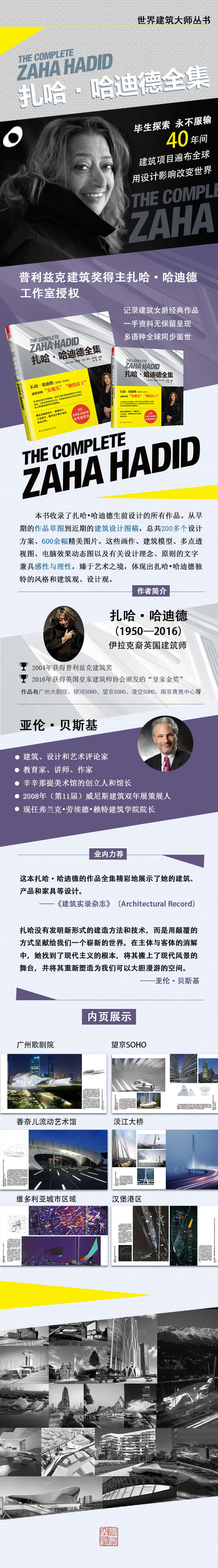 本書收錄了歷史上一位獲得普利茲克建筑獎的女建筑師——扎哈·哈迪德生前所設(shè)計的所有作品。這些作品體現(xiàn)出了如其人的風(fēng)格,表現(xiàn)強烈,感性與理性兼具,并以流暢的線條取代傳統(tǒng)建筑的幾何架構(gòu)。書中收納了她從早期的作品、草圖到近期的建筑設(shè)計圖稿,總計200多個設(shè)計方案、600余張精美圖片,其中包含巨幅畫作、建筑模型、多點透視圖以及電腦效果動態(tài)圖等等。