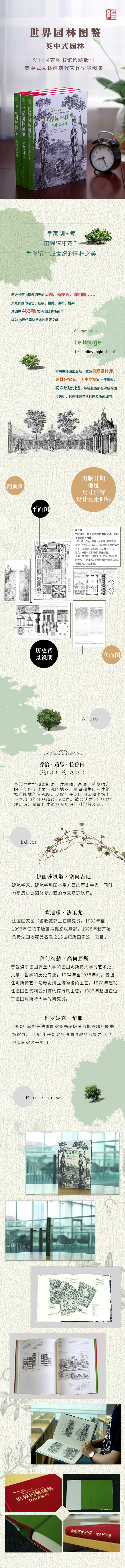 本書收錄了將近500幅位于歐洲和中國的園林平面圖及編者見解,同時(shí),此作品作為18世紀(jì)園林藝術(shù)的重要文獻(xiàn)成為歷史學(xué)家們研究相關(guān)學(xué)科的一手資料。全書分為二十一冊(cè),按照拉魯日出版年份順序編排,其中包含邱園、斯陀園、圓明園等世界聞名的經(jīng)典園林。