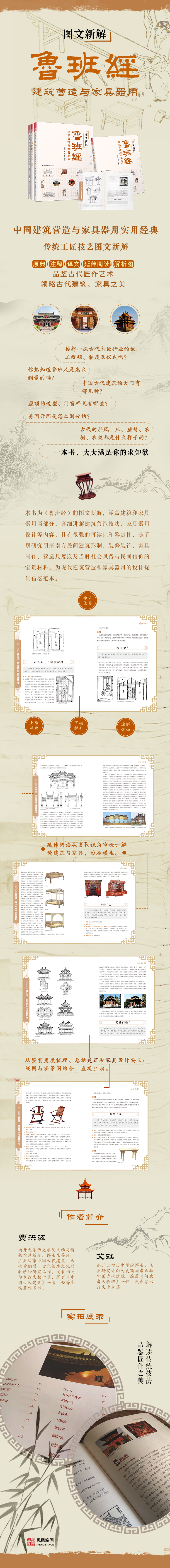 ?全書(shū)細(xì)化為建筑營(yíng)造與家具器用兩部分,采用《魯班營(yíng)造正式》與《魯班經(jīng)》的參照對(duì)比的形式進(jìn)行論述,不僅是古代建筑構(gòu)造、家具制法的全程指導(dǎo)性參考書(shū)籍,更是一本中國(guó)古代匠作品鑒書(shū)籍