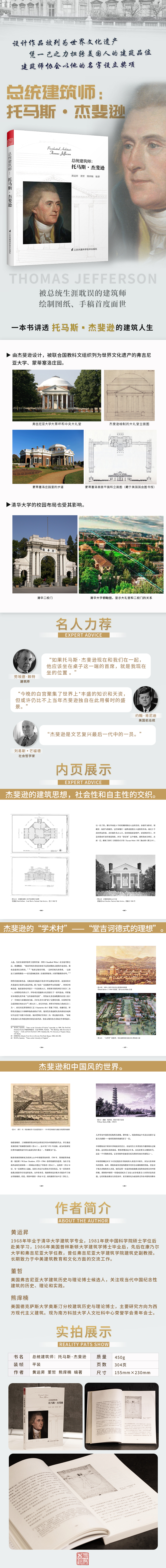 該書由弗吉尼亞大學(xué)建筑學(xué)院黃運(yùn)昇教授倡議并編寫,盡可能用平實(shí)的材料和親切的語言讓更多人走近杰弗遜的建筑遺產(chǎn)。除蒙蒂塞洛、白楊林莊園、弗吉尼亞大學(xué)、弗吉尼亞州議會(huì)大樓幾處專題之外,各章均把杰弗遜的建筑貢獻(xiàn)放在更廣的維度里去考察,有時(shí)或許會(huì)從多個(gè)角度討論同一對(duì)象。書中還引用了大量英文的參考文獻(xiàn),并盡量提供原文對(duì)照,方便讀者學(xué)習(xí)參考。