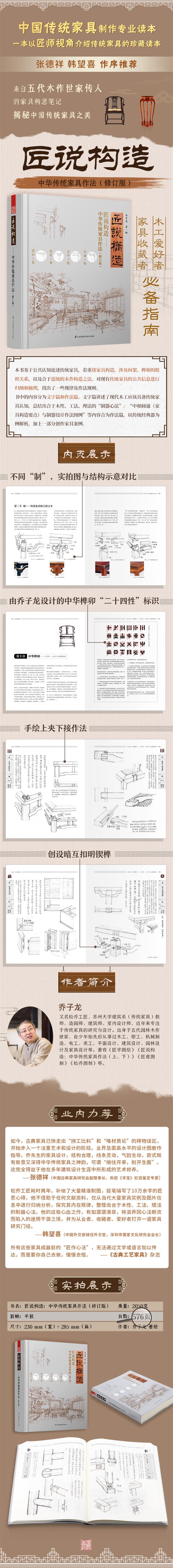 《匠說構(gòu)造——中華傳統(tǒng)家具作法(修訂版)》是作者集二十多年的思考與研究,這本書從家具的構(gòu)造出發(fā),從中探究其規(guī)律與原理,為建立現(xiàn)代中國家具學(xué)體系提供構(gòu)架性建議?,F(xiàn)今有關(guān)于家具的著作基本上是對(duì)成器家具的圖賞或文學(xué)點(diǎn)評(píng),少有對(duì)家具成器前的作法介紹,偶有幾本關(guān)于制作的,但也不夠系統(tǒng),不夠深入。留存至今的傳統(tǒng)家具的測(cè)繪、辨識(shí)、鑒賞、技術(shù)法則及匠工術(shù)語,甚至有關(guān)于型制、制式、款式等這些專業(yè)詞匯,更是讓人云里霧里,似懂非懂。而《匠說構(gòu)造》這本書對(duì)以上疑問逐一作了詳細(xì)的解答。