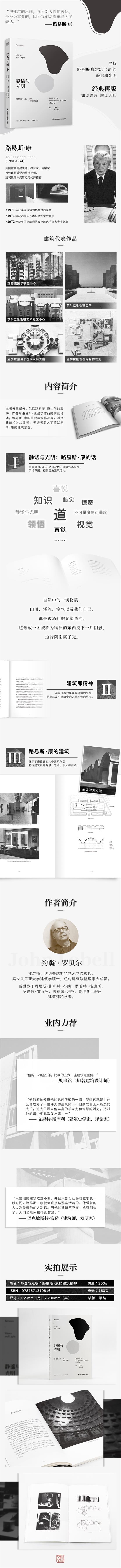 《靜謐與光明:路易斯·康的建筑精神》由美國(guó)建筑師、學(xué)者約翰·羅貝爾編寫,全書以散文筆法闡述了路易斯·康的建筑精神。 本書分為三部分,“靜謐與光明:路易斯·康的話”從多個(gè)角度整理了康的演講詞,文字優(yōu)美,充滿哲學(xué)味道和詩意;“建筑即精神”為作者對(duì)康代表的建筑精神的領(lǐng)悟,從建筑內(nèi)部一一講述,并附有建筑照片和圖紙; “路易斯·康的建筑”介紹了康的八個(gè)代表作品,作為康建筑思想的體現(xiàn),簡(jiǎn)潔直觀,磅礴大氣,神秘悠遠(yuǎn)。
