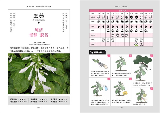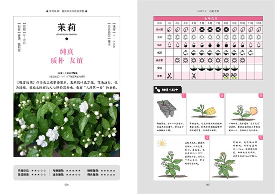 養(yǎng)花的過程累并快樂著,書中的手繪養(yǎng)護(hù)步驟觀感輕松,全年花歷一目了然,配色小貼士溫暖貼心,光、溫、水、土、肥、病蟲害防治等知識點(diǎn),統(tǒng)統(tǒng)有述。無論你遇到什么養(yǎng)花疑惑,身處在南方,還是北方,都能找到適合自己院子種植的美麗花卉。