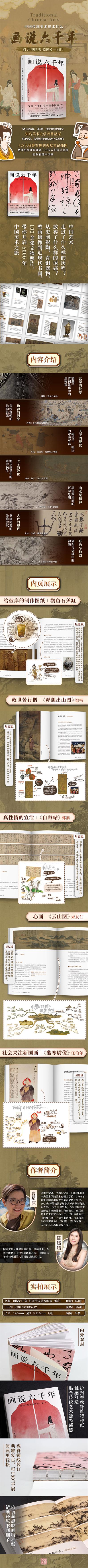 全書共分七章,第一章主要介紹了鸛魚石斧缸、御龍圖等展現(xiàn)古人生死觀的器物,探討中華民族追憶先祖這一文化習(xí)俗的歷史淵源。第二章細(xì)致講解了敦煌五百強(qiáng)盜成佛因緣圖壁畫、云岡大佛等佛教藝術(shù)在我國古代的發(fā)展。第三、四章圍繞宮廷藝術(shù)品,探討包括《女史箴圖》《韓熙載夜宴圖》等體現(xiàn)古代帝王生活樣貌的畫作。第五章借山水畫,介紹作品與畫家間的關(guān)系,展現(xiàn)了作者的精神面貌與思想。第六章詳細(xì)介紹了《珊瑚筆架圖》《容膝齋圖》等藝術(shù)作品對新的書畫語言的探索與使用,展現(xiàn)了那些表達(dá)個(gè)性與特定感情的書法作品和文人畫接近19世紀(jì)起源于歐洲的現(xiàn)代藝術(shù)運(yùn)動(dòng)的藝術(shù)形式,也就是古代的現(xiàn)代。第七章則介紹了以《搜盡奇峰打草稿》《千巖萬壑圖》為代表的17—19世紀(jì)具有獨(dú)創(chuàng)性的中國藝術(shù)作品,它們的出現(xiàn)打破了當(dāng)時(shí)中國藝術(shù)上保守陳舊的局面,創(chuàng)造了又一波中國美術(shù)創(chuàng)作的高光時(shí)刻。