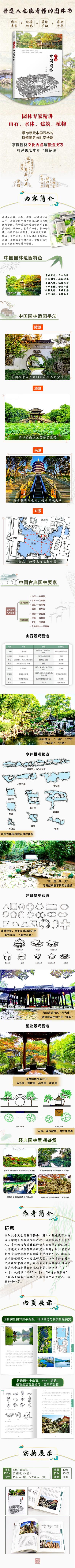 市面上園林方面的著作很多,但要么偏于景觀鑒賞,要么偏于學(xué)術(shù),本書由景觀園林專家同時(shí)也是浙派園林科普作家執(zhí)筆,融zhuan業(yè)知識與景觀鑒賞于一體,從山石、水體、建筑、植物四方面入手,講解古典園林的造園特色和造園手法,每種景觀的營造還給出兩個(gè)園林的實(shí)際案例以幫助理解。書中有350余幅圖片,線圖結(jié)構(gòu)清晰,用于講解造園手法和園林zhuan業(yè)知識;平面圖用于觀看園林地形與構(gòu)造;實(shí)景圖則景色優(yōu)美,可直觀感受園林的魅力。本書文字優(yōu)美,深入淺出地講解zhuan業(yè)知識,絲毫不會有教材般干巴巴的枯燥,是一本美觀、易讀,既有視覺享受、又能學(xué)到園林干貨知識的好書。