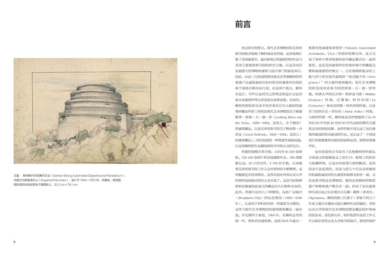 2017年,紐約現(xiàn)代藝術博物館舉行了賴特誕辰紀念展,本書是同期的出版物。這本書是展覽的延伸和深化,匯集眾多學者的研究成果和評述性文字,在多學科視閾下對賴特進行研究,超越了建筑本身,從全新的角度看待賴特與其建筑,為賴特研究注入了新觀點、開辟了新視角。