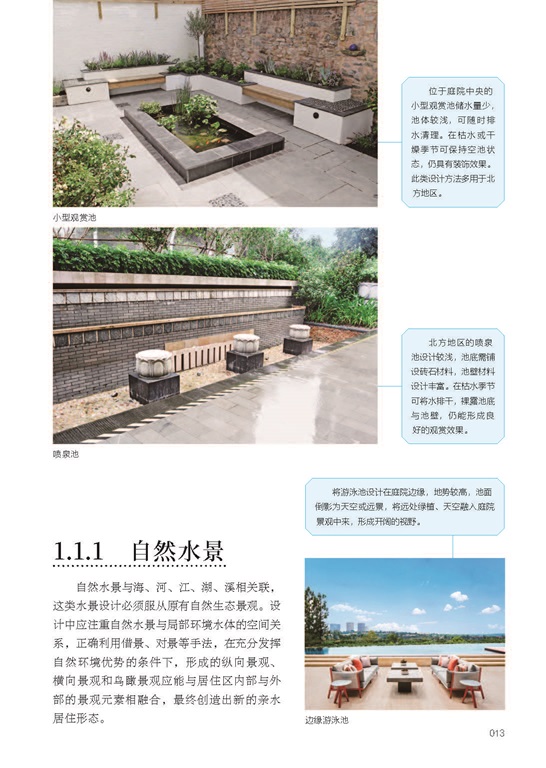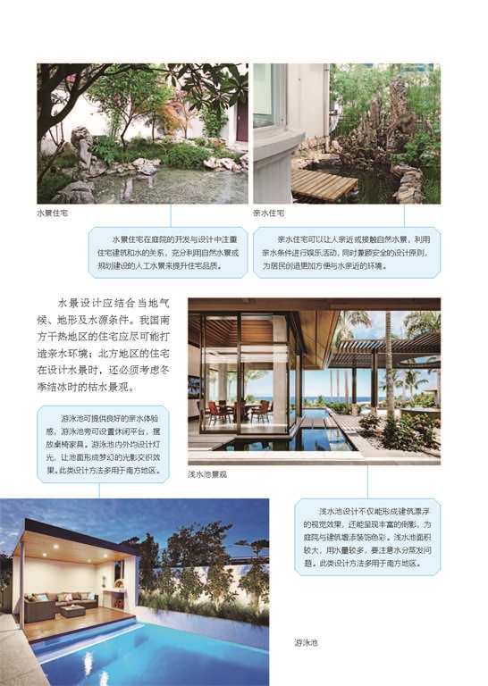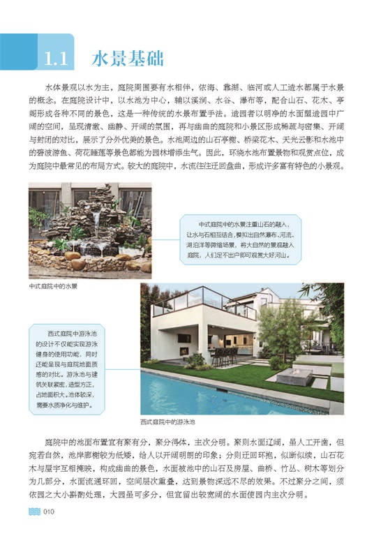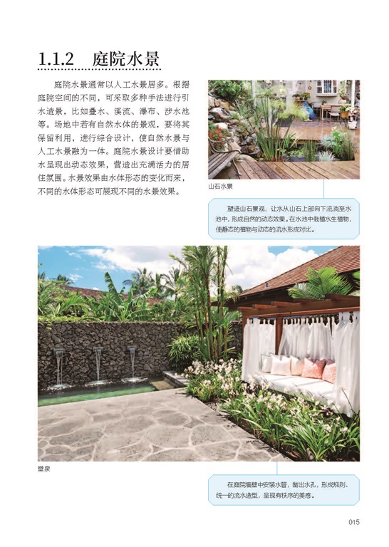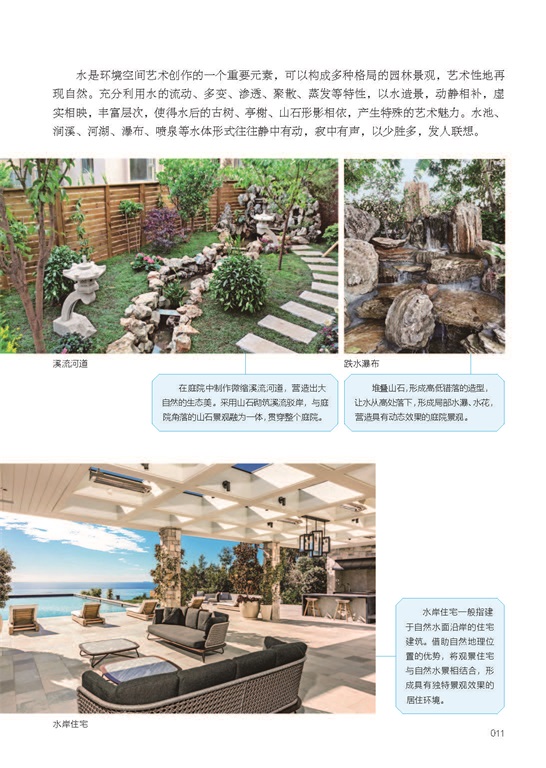 水景類型、水景設(shè)計(jì)細(xì)節(jié)及材料;第三章介紹了溪流、水簾瀑布、池塘、水池、游泳池、噴泉、壁泉、滴泉八類水景的設(shè)計(jì)與施工方法;第四章介紹了水景植物的選擇和種植知識(shí);第五章介紹了景觀橋、排水排水、水體凈化、灌溉系統(tǒng)等相關(guān)知識(shí)和具體案例。為庭院設(shè)計(jì)師、景觀設(shè)計(jì)師提供相關(guān)參考。