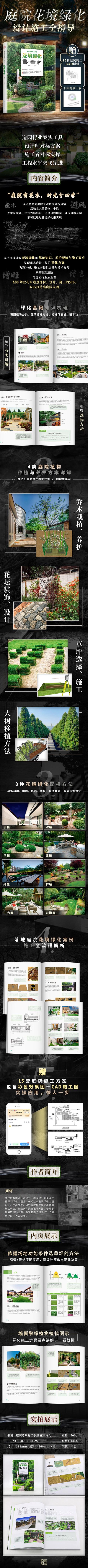 本書講解庭院中的花境綠化有關內(nèi)容,共四章,首章為綠化的基礎知識,介紹庭院中綠化植物的主要品類和選 擇方法;次章為種植和養(yǎng)護知識,主要介紹不同種類、不同造景形式的植物的種植養(yǎng)護方式;第三章為花境綠化的 配植方法,如配植原則、配植方式、不同建筑小品和綠化的組合等等;第四章為綠化構造設計施工,介紹各種樹籬、 圍欄、花壇、花箱、樹池、地被、菜地、景墻等花境綠化設施的設計施工方法 ,還有六個案例解析,為庭院設計師與施工員提供參考。