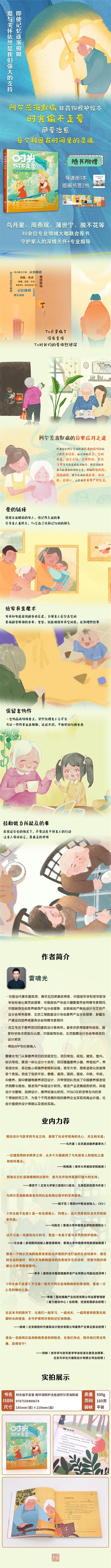 《時(shí)光偷不走愛》是一本充滿愛心、同理心、設(shè)計(jì)思維和社會(huì)關(guān)懷的創(chuàng)意作品。作者是一名專為老年人設(shè)計(jì)生活空間的建筑師,聯(lián)同一群熱愛生活、有責(zé)任感的青年藝術(shù)家通過繪畫作品促使讀者更能理解場景設(shè)計(jì)學(xué), 更能理解用環(huán)境照護(hù)的方式緩解阿爾茨海默病。內(nèi)容含有豐富的親情元素, 讓讀者很好地代入案例故事里; 生動(dòng)的漫畫亦讓讀者有更多的想象空間。書中用詳細(xì)介紹了如何調(diào)整居住空間,以增強(qiáng)患者的安全感和舒適度。通過繪本+ 建筑設(shè)計(jì)+ 阿爾茨海默病+ 非藥物照護(hù)的奇妙組合,詳細(xì)介紹了如何調(diào)整居住空間和照護(hù)、交流方式,以增強(qiáng)患者的安全感和舒適度。無論是家庭照護(hù)者、照護(hù)師、還是建筑師、設(shè)計(jì)師,都可以從中獲得靈感,為阿爾茨海默病老人打造一個(gè)更為溫馨、舒適的居住環(huán)境。