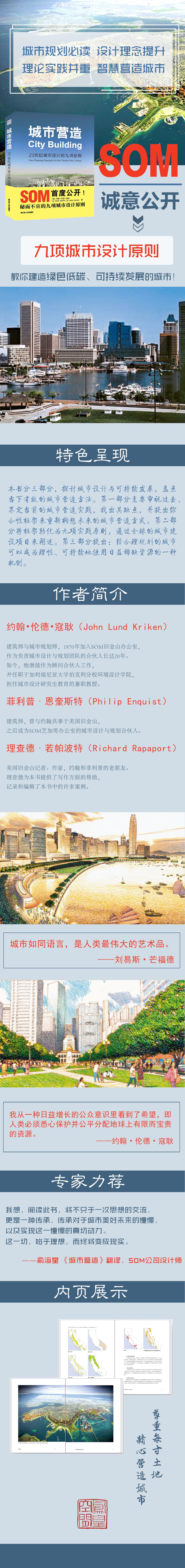 成功的城市來(lái)自于人們倡導(dǎo)更容易的去理解人的價(jià)值和原則,這些原則兼顧到感官,觸覺(jué)和環(huán)境可持續(xù)的特性,以及人們?nèi)σ愿叭プ龀龅脑O(shè)計(jì)。同時(shí),這些原則應(yīng)該可以普遍適用,并被人們所認(rèn)可。作者希望在書(shū)中闡述的這些SOM一直在使用的原則,可以使關(guān)心城市生活的人們?nèi)プ鲆恍┧麄冊(cè)谠诤芫靡郧熬蛻?yīng)該做的事情:更負(fù)責(zé)任并尊重地使用土地,在智能和適當(dāng)?shù)幕A(chǔ)設(shè)施背景內(nèi)建造城市。???