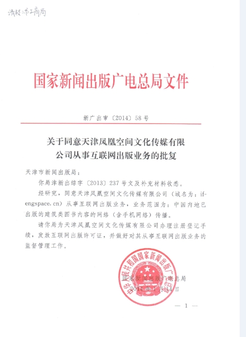 2014年1月14日,經(jīng)國家新聞出版廣電總局、天津新聞出版局研究,同意天津鳳凰空間文化傳媒有限公司(域名為:ifengspace.cn)從事互聯(lián)網(wǎng)出版業(yè)務(wù),業(yè)務(wù)范圍為:中國內(nèi)地已出版的建筑類圖書內(nèi)容的網(wǎng)絡(luò)(含手機(jī)網(wǎng)絡(luò))傳播。